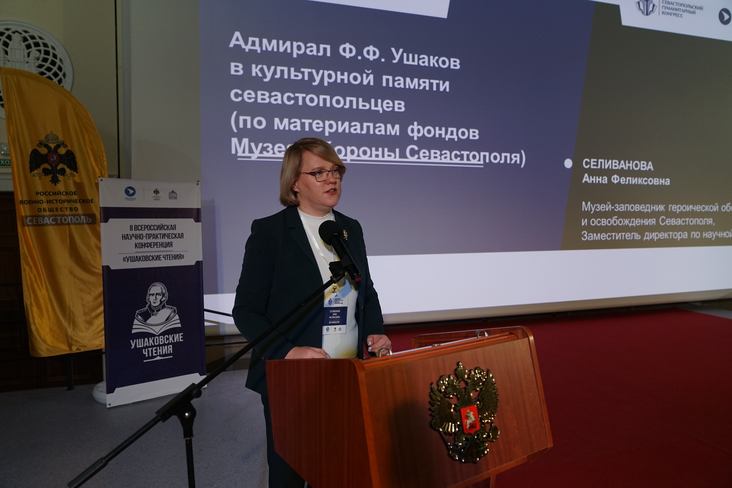 От Музея спикером выступила заместитель директора по научной работе Музея обороны Севастополя Анна Селиванова с докладом на тему «Адмирал Ф.Ф. Ушаков в культурной памяти севастопольцев (по материалам фондов Музея обороны Севастополя)».