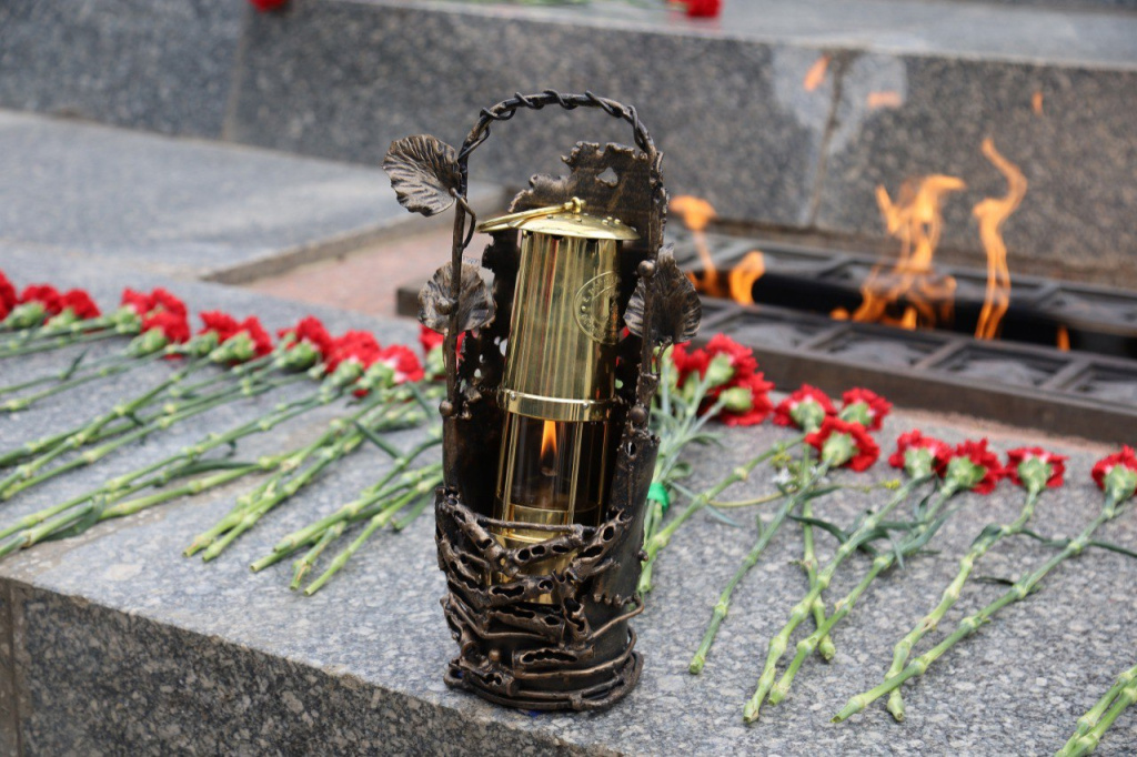 Огонь был собран в шахтерскую лампаду, оклад для которой выкован донецким кузнецом Виктором Михалевым и будет передан 9 мая в Брестскую крепость.